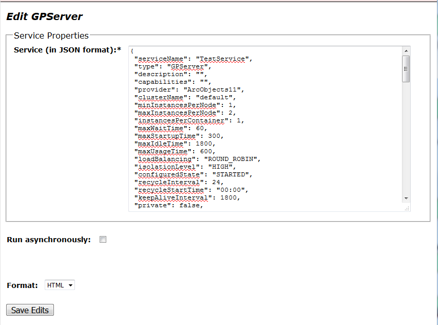 The following properties for geoprocessing services are advanced settings that cannot be set using ArcGIS Server Manager or the Server Properties dialog box in ArcGIS Desktop. The majority of geoprocessing services will not need to modify these settings.